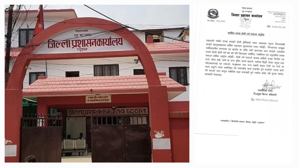 प्युठान। जिल्ला प्रशासन कार्यालय प्युठानले होली पर्वलाई मर्यादित र अनुशासित तरिकाले मनाउन जिल्लाबासीलाई..