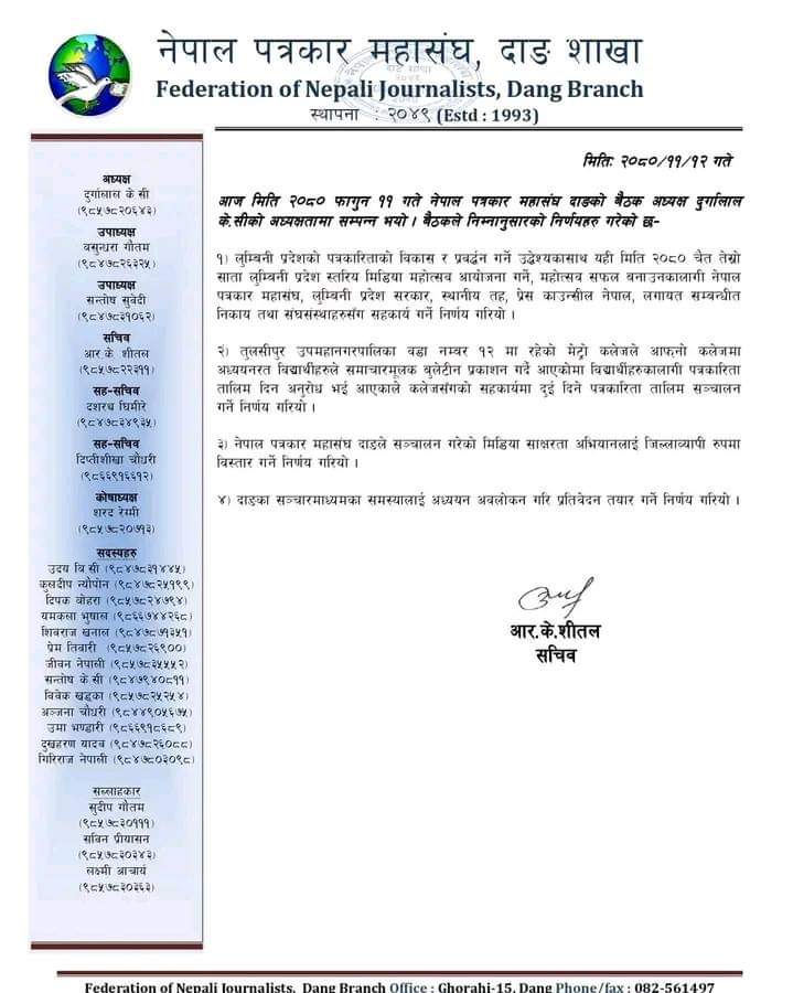 १२ फागुन, घोराही- नेपाल पत्रकार महासंघ दाङले लुम्बिनी प्रदेश स्तरिय मिडिया महोत्सव आयोजना गर्ने भएको छ । महासंघ..
